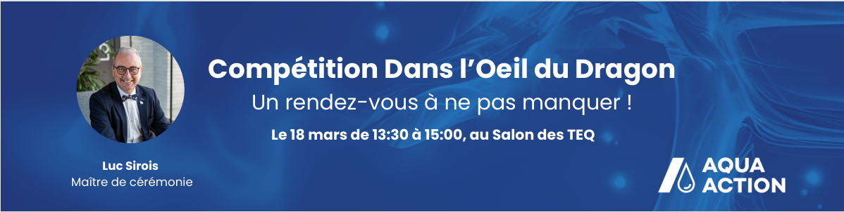 Dans le cadre du STEQ, AquaAction est fière de vous présenter l'Œil du Dragon : un concours de pitch exclusif réunissant des startups innovantes de la communauté AquaAction autour des grands enjeux de l'eau.